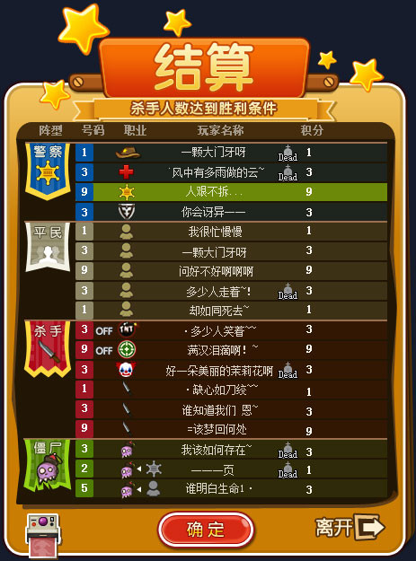 1.杀手一方全部死去,则警察及平民获胜。 2.警察一方全部死去,则杀手获胜。 3.平民全部死亡,则杀手获胜。 4.杀手数量大于或等于存活数量的一半以上时,杀手直接获胜。 5.当白天投票结束后,各种角色都只剩下1人,杀手直接获胜,不用进入黑夜。 6.全警察阵亡,医生还在,杀手胜出。 7.全杀手阵亡,狙击手还在,警察及平民胜出。 8.如总天数到达15天还未分胜负,将会没一方胜出,每位玩家同样得到相应惩罚。